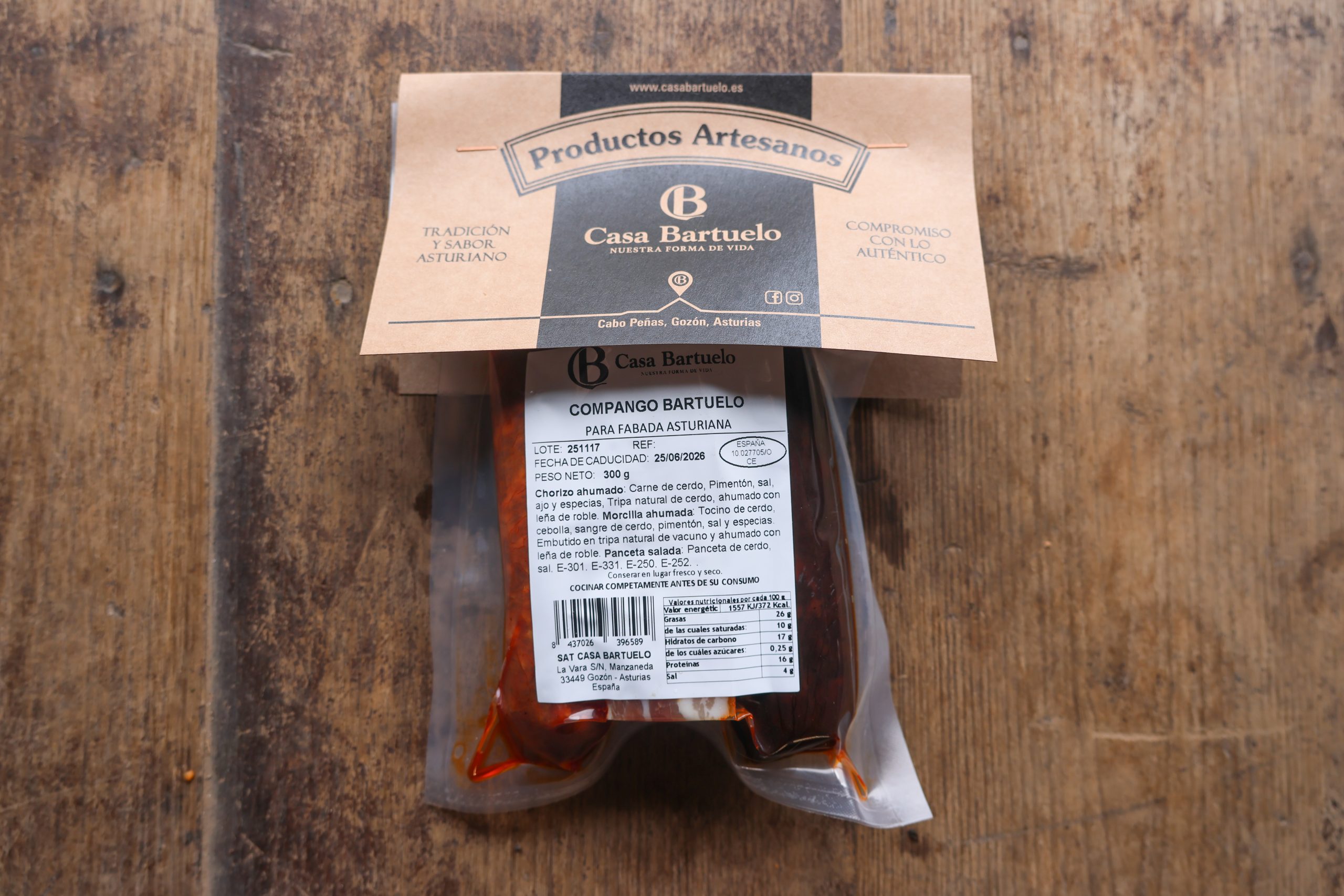 El Compango Asturiano está formado por Morcillas y Chorizos Asturianos acompañados de Panceta Curada. Listos para usar conjuntamente en la elaboración de nuestra Faba Asturiana IGP o cualquier otro guiso o estofado y especialmente indicado para el «pote asturiano».