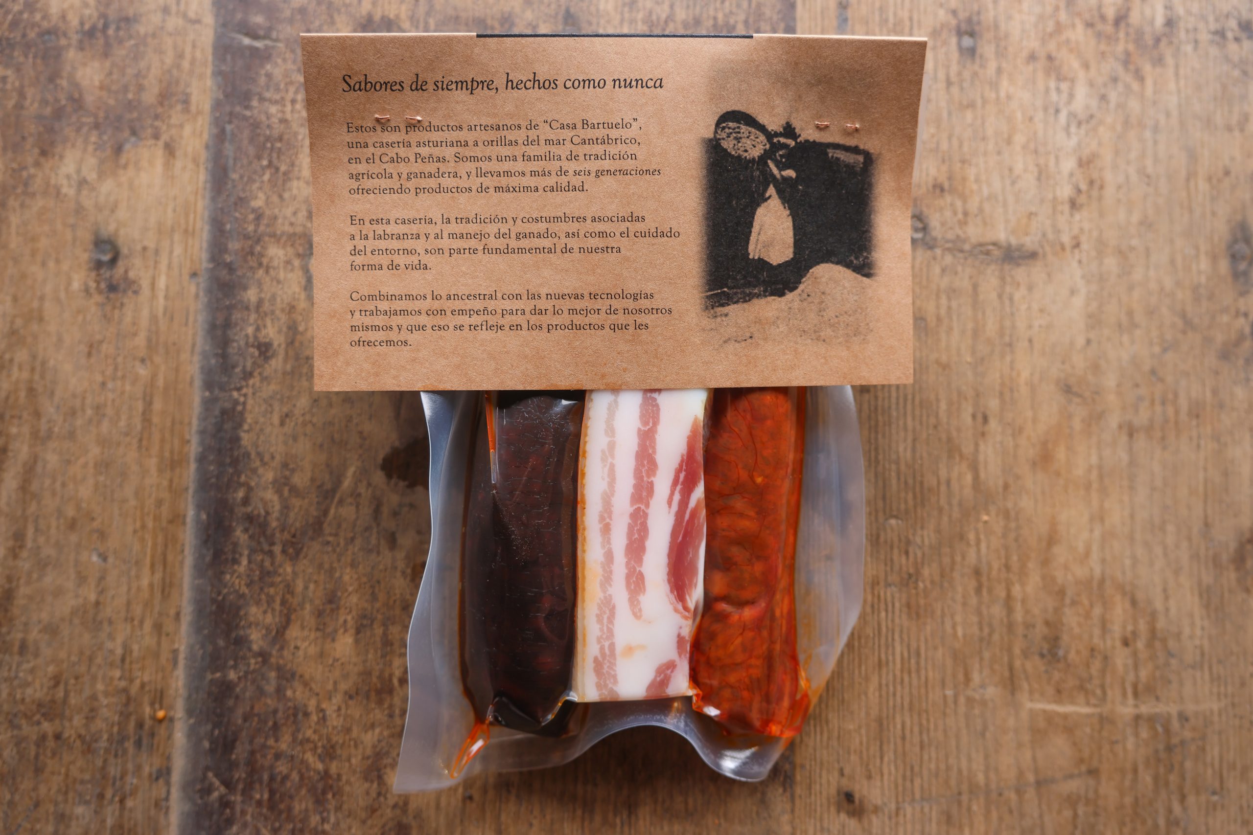 Chorizo Asturiano Ahumado: carne de cerdo, tocino, pimentón, sal y ajo. Envoltura tripa natural de cerdo. Morcilla Asturiana Ahumada: cebolla, tocino, sangre de cerdo, pimentón, harina de maíz, sal y perejil. Envoltura tripa natural de vacuno. Panceta Curada: panceta de cerdo, sal, conservadores (E-252 y E-250), antioxidante (E-301). Lacón Curado: lacón de cerdo, sal, conservadores (E-252 y E-250), antioxidante (E-301).
