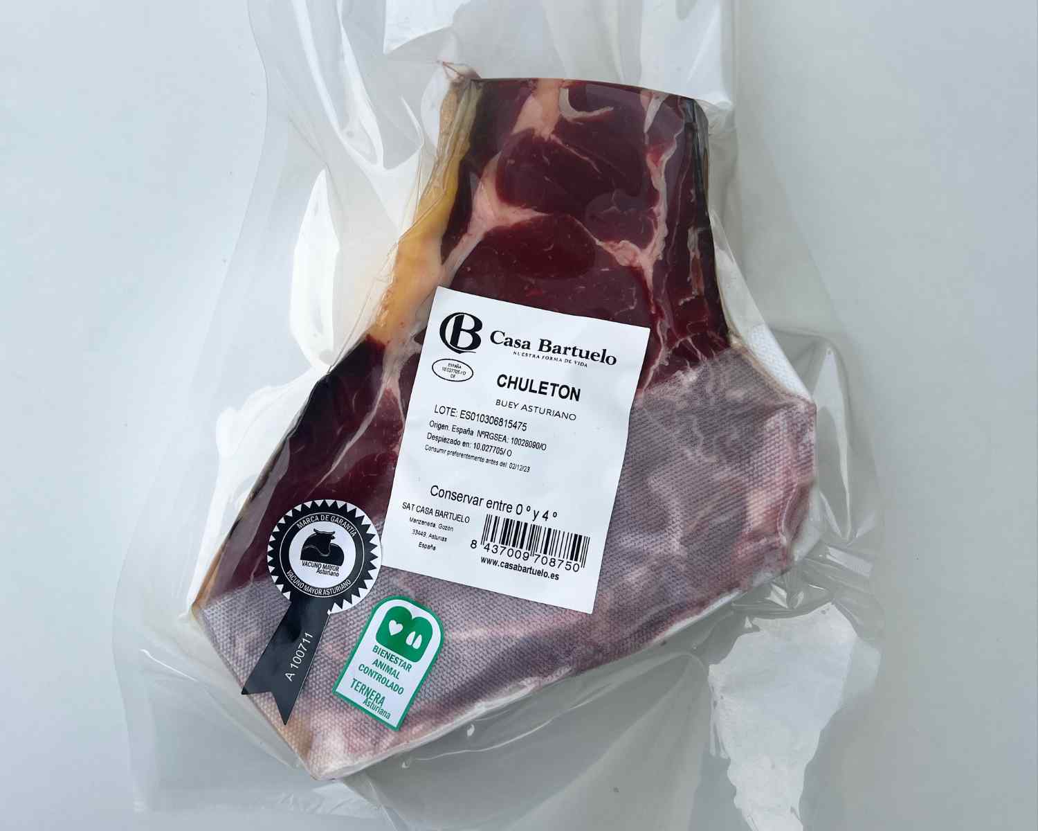El chuletón de buey es uno de los cortes mas codiciados por quienes disfrutan de la buena mesa. Procedentes de nuestra ganadería, certificada con el sello de Bienestar Animal. Y de bueyes machos castrados criados en los pastos cantábricos de Manzaneda. Su alimentación natural se completa con el silo de cereales de cosecha propia. Estos chuletones están madurados en la cámara de nuestra sala de despiece durante 20- 25 días. Todo sabor. El chuletón de buey de Casa Bartuelo es la máxima expresión del sabor de la carne de Asturias.